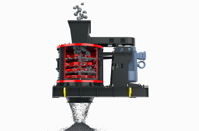 物料由設(shè)備上部垂直落入高速旋轉(zhuǎn)的葉輪內(nèi),在高速離心力的作用下,與另一部分以傘狀形式分流在葉輪四周的物料產(chǎn)生高速撞擊與粉碎,物料在互相撞擊后,又會在葉輪和機殼之間以物料形成渦流多次的互相撞擊、摩擦而粉碎,從下部直通排出,形成閉路多次循環(huán),由篩分設(shè)備控制達到所要求的成品粒度。