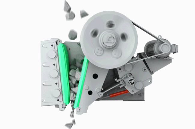 CJ系列歐版顎式破碎機工作時,電動機驅(qū)動皮帶和皮帶輪,通過偏心軸使動顎上下運動,當(dāng)動顎上升時肘板與動顎間夾角變大,從而推動動顎板向固定顎板接近,與其同時物料被壓碎或劈碎,達到破碎的目的;當(dāng)動顎下行時,肘板與動顎夾角變小,動顎板在拉桿、彈簧的作用下,離開固定顎板,此時已破碎物料從破碎腔下口排出。